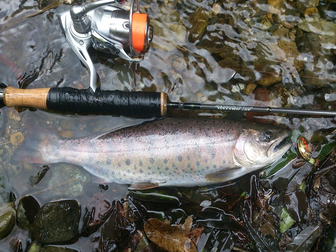 ラインの先で暴れるヤマメの姿は相当なサイズです![]()