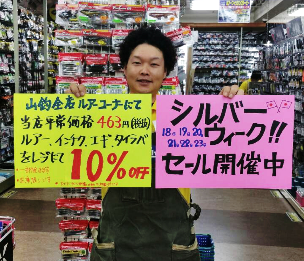 『当店平常価格463円以上(税抜)のルアーをレジにて平常価格より10%OFF』となっております![]()