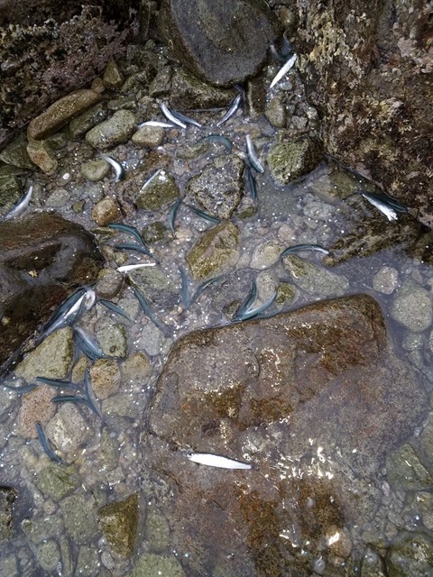 追われたイワシが次々と打ち上げられ