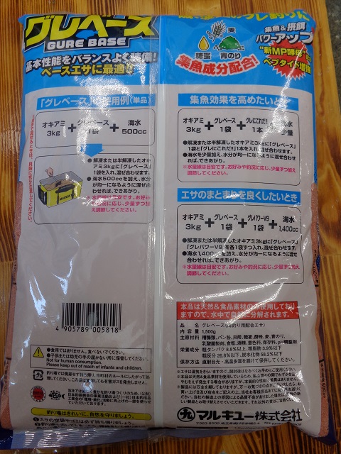 ベースエサに必要な遠投性、拡散性、まとまりなど基本性能をバランス良く備えた作りになっています。麦、糖蜜、青のりとグレが好む具材がたっぷり入っています🐟![]()