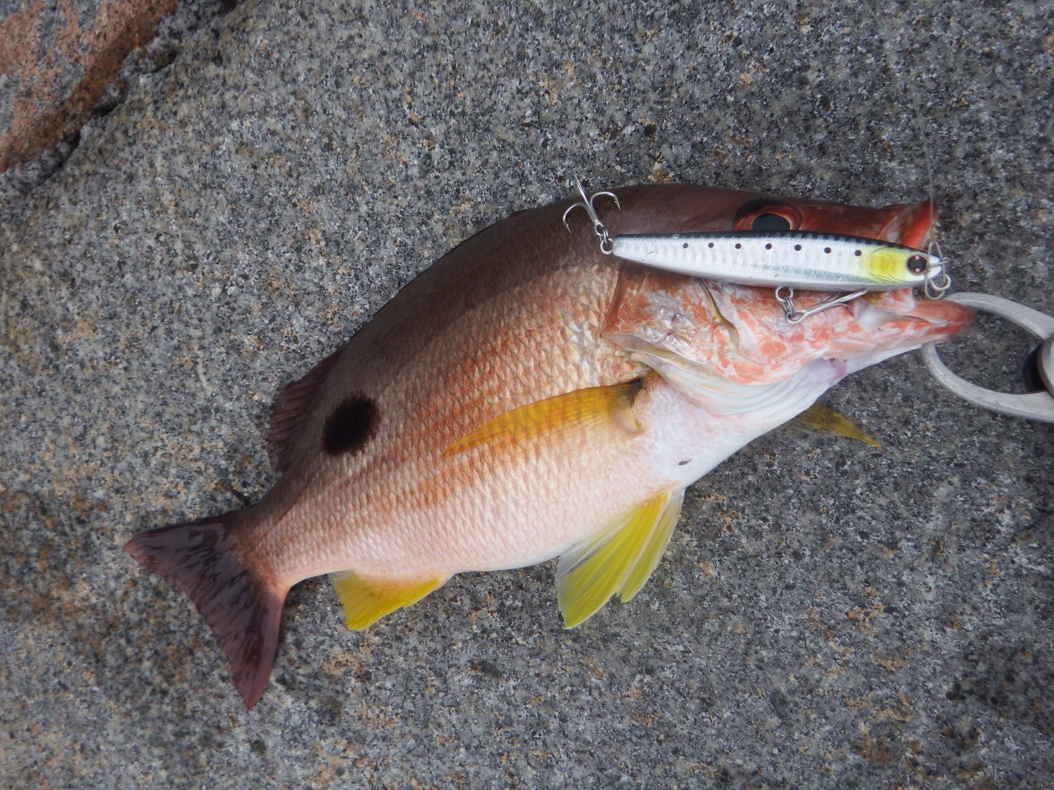 かかってくれたのはクロホシフエダイらしき魚![]()
