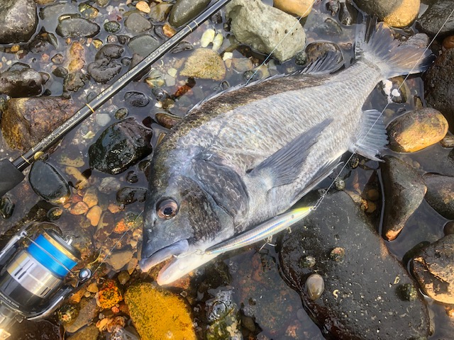更に手前と沖でベイトが何者かに追われていたので、沖にMクワイエット(タックルハウス)を遠投すると、、、ヒット![]()
